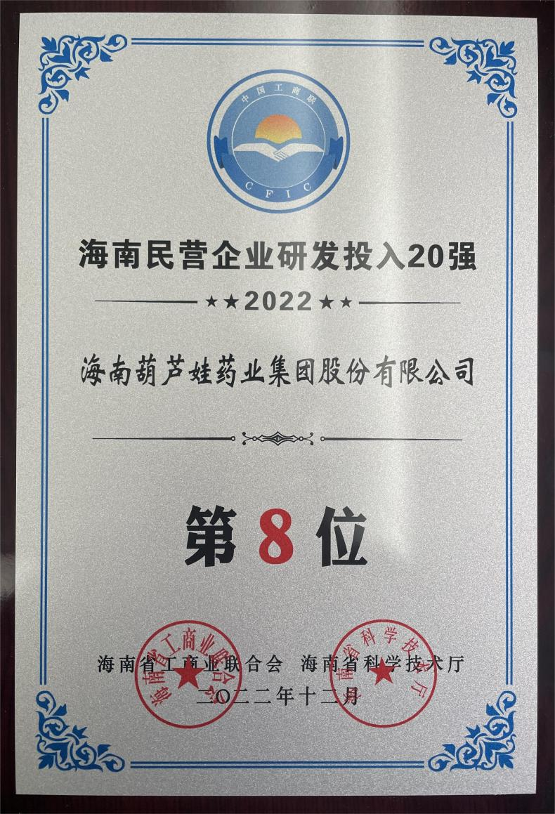 12月23日,2022海南民营企业50强和研发投入20强发布会在海口举行。会上发布了“2022海南民营企业50强”“2022海南民营企业研发投入20强”榜单和分析报告。SG胜游药业再次荣登两榜,在海南民营企业50强榜单中位列第25位,较去年上升8位,这也是公司连续三年登榜;在海南民营企业研发投入20强中位列第8位,较去年上升7位。